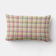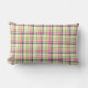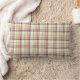 Vierkant kussen met een reproductie van een  geruite motief uit 1968 in ivoor, warm roze, limoengroen en zwart. Rechthoekig lumbaal steunkussen ook beschikbaar.