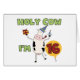 De tekst luidt "Heilige Koe ik ben 16" op 16e verjaardag T-shirts, mokken, kaarten, knoppen, magneten, postzegels en andere 16e verjaardagskleding en cadeaus met een schattige cartoon koe op een feestje pet met een verjaardagscadeau en verjaardagstaart!