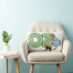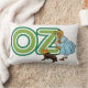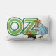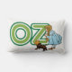 Grote tekstletters die het woord 'OZ' spellen met het kleine meisje Dorothy in een retro blauwe geruite jurk en haar huisdierhond Toto.