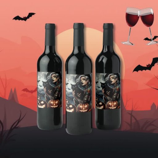Halloween feest gepersonaliseerde gunstboxen. Pak je bezem en vlieg! Spookachtige gotische getatoeëerde heks met een zwarte kat, vleermuizen en afbeeldingen van volle maan.
