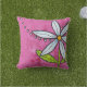 Dit decoratieve kussen in buitenstof heeft een felle, gewaagde, grillige witte madeliefbloem met een geel midden en levendige groene bladeren geaccentueerd door witte stippen op een roze achtergrond.