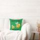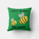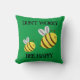 Maak je geen zorgen. Wees blij. Deze woordspeling is geschreven in noodlijdende hoofdletters op een helder groen vierkant kussen, en versierd met twee cartoon-stijl, heel schattig, baby. De bijen zijn voornamelijk lichtgeel en de tekst is zwart. Het ontwerp bevindt zich aan beide zijden van de kussen/kussen.