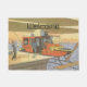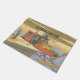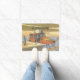 Eenvoudig te personaliseren deze welkomstmat met uw aangepaste tekst! illustratie Victoriaans futuristisch stoomontwerp punk reizen en vervoer science fiction ontwerp. Een zwevende steampunk helikopter vliegtuig limousine wachten door het gebouw zweven over de stad in de toekomst. De butler en de dienstmeid brengen de bagage naar het vliegtuig. De futuristische rijken en beroemdheden staan op het punt om op vakantie te gaan! Een retro stripboek Sci Fi design.