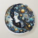 Een kussen met een hemels ontwerp. Sterren, maan, planeten en een ster en kind gezicht.