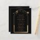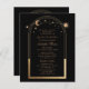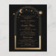 Celestial Black Gold Bilingual Spanish Quinceañera Invitations beschikt over een sierlijke gouden zon, maan en sterrenhemel met een gouden lijst op een zwarte achtergrond. Binnen is uw aangepaste Quinceañera uitnodiging informatie in het Engels. Op de keerzijde staat de uitnodiging in het Spaans. Personaliseer door de tekst in de tekstvakken te bewerken. Ontworpen voor u door Evco Studio www.zazzle.com/store/evcostudio