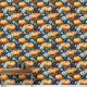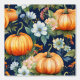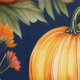 Oranje pompoenen in kleurrijke florale patch op donkerblauwe achtergrond.