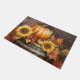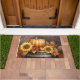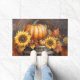 Een mooie deurmat van herfst- of herfstkleuren of oogsttijd. Pompoenen, zonnebloemen en herfst gebladerte op een vat met vlinders. Echt !