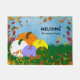 Afbeelding van een herfstscène, met bladeren die op pompoenen vallen.
