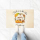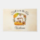 Een welkome deurmat met een typografisch ontwerp dat zegt dat er Herfst in de lucht is. Geïllustreerd met een schattige eekhoorn die achter enkele oranje waterverf pompoenen staat. Een versierde loof krans omringt hen met een eikenblad, een eikel, herfstbloemen en andere takjes en bladeren van sinaasappel. Achtergrond is een uitziende gebroken wit met verouderde lichtbruine randen.