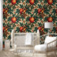 Grote, rustieke vruchten en kleine rode en oranje bessen worden afgewisseld met groene bladeren op dit prachtige behang met een herfst-thema. Het hele jaar door kleur toevoegen aan je kamer!