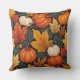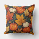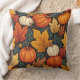 Dit kussen heeft een patroon van gevallen bladeren en pompoenen, die de herfst symboliseren.