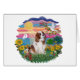 De herfstzon schijnt op een Blenheim Cavalier King Charles Spaniel tegen een achtergrond van kleurrijk herfstgebladerte terwijl een duif eraf vliegt en een blauwvogel zingt op een tak vol felgekleurde bladeren.