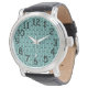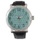 Dit mannen horloge heeft een modern ontwerp uit het midden van de eeuw van vierkanten met een lijn en een lijn van cirkels, allemaal zwart, herhalend over het ontwerp op een veld van zeeschuim. Als je het ontwerp leuk vindt, maar liever verschillende kleuren hebt, stuur me dan een bericht.