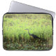 Een foto van een Grote Blauwe Reiger die door een vijver loopt. Het oppervlak van de vijver is bedekt met waterlelies. De vijver is omringd door stengels van groene planten, die grenzen aan een weide. Fotorechten ©2021 Kimberly J Tilley.