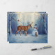 Een grappige scène van een hert dat de wortelneus van een sneeuwpop en een konijntje eet en om een stuk bedelt.