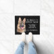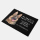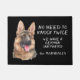 "We hoeven niet twee keer te kloppen, we hebben een Duitse Shepherd" verklaart deze grappige deurmat. De tekst is wit aan de rechterkant, terwijl een portret van een mooie zwarte en beige GSD aan de linkerkant is. Alles wordt op een zwarte achtergrond geplaatst.