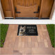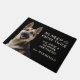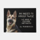 "We hoeven niet twee keer te kloppen, we hebben een Duitse Shepherd" verklaart deze grappige deurmat. De tekst is bleek geelbruin aan de rechterkant, terwijl een portret van een mooie GSD aan de linkerkant staat. Alles wordt op een zwarte achtergrond geplaatst.