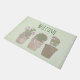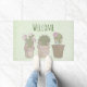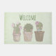 Welkom deurmat met een grillig ontwerp. 3 schattige cactus op een rij met glimlachende gezichten die in een bloempotje zitten en elk een juwelen dragen.
