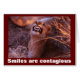 Het glimlachen van de Lion Cub-glimlach is een besmettelijke Wenskaart met een prachtige foto van een jonge Afrikaanse leeuw, genomen door Kurt Keller met een camera van 35 mm terwijl hij op een Afrikaanse safari in Botswana, Zimbabwe en Zuid-Afrika staat. Onder de gelukkige Tau (leeuw in Tetswana, de taal van Botswana) zijn de aanpasbare woorden, glimlachen zijn besmettelijk, wit. Aan de binnenkant van de kaart staan de aanpasbare woorden, ga naar voren en contamineer zoveel mogelijk woorden. Deze schattige glimlachende leeuwenkub deed een dutje met zijn of haar trots in de bruine wintergrassen van de Afrikaanse savanne. Toen de jeep stopte, keek deze leeuwenkub op, gapen, en gaf ons een kauwende, ijzige glimlach. Iedereen die van dieren houdt, alle Afrikaanse dierenvrienden, leeuwenliefhebbers, grote kattenliefhebbers en natuur fotografie-liefhebbers, zal genieten van dit dierlijke afbeelding van een schattige jonge glimlachende leeuw in het gras. Deel vandaag een glimlach met deze leuke dierenkaart.