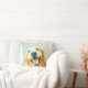 Deze kussen voorzien van een waterverf van een glimlende gouden hondje op een blauwe achtergrond.