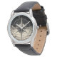 Deze surrealistische zwart-witafbeelding toont een ingewikkeld kompas roos dat midden in een uitgestrekte, desolate woestijn staat onder een sterrenhemel. Omcirkeld door een ring lijkt het kompas tijdloos te zweven, wat navigatie, bestemming en het nastreven van doel symboliseert. De grillige bergen omringen de horizon, terwijl de grond eronder onvruchtbaar is, wat een reis door eenzaamheid en kosmisch mysterie suggereert. Het kunstwerk combineert elementen van astronomie en cartografie en roept een gevoel van verkenning op voorbij zowel land als sterren.