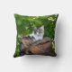 Een kat zit in de groene tuin, naast een log en kijkt vooruit - twee verschillende kanten