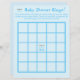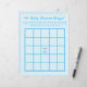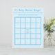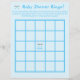 Het ontwerp heeft een bleke blauwe achtergrond naar een bingobord. Center design is gemarkeerd als vrije ruimte met het afbeelding van een regenwolk die blauwe regen doucht. Instructies en koppen zijn aanpasbaar, zodat je het spel kunt personaliseren! Coördineert met de "Het is een jongen! Blauw Baby shower" collectie.
