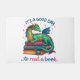 Levendig, kleurrijk ontwerp met een stapel boeken, een kleurrijke draak bovenop en een paddenstoel. De tekst luidt: "Het is een goede dag om een boek te lezen". Dit ontwerp is beschikbaar op een breed scala van producten.