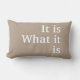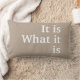 "Het is ... Wat het is... Inspirerend kussen, Soft Khaki toon met witte krullende letters.