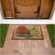 Vallende bladeren landschap monogrammed deur mat. Groen, geel, sinaasappel, roest en rood blazende bladeren gooiden de lucht van de verre bomen. Prachtige rustieke herfstlandschap en het gevoel van Herfst op een waarschuwen stenen achtergrond om uw inrichting voor het vakantieseizoen te verbeteren. Geweldig voor Amerikaanse en Canadese Thanksgiving Feestdagen.
