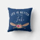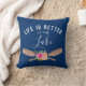 Deze bijtende blauwe kussen van de zee van de kerkvaars zijn voorzien van twee houten doorgesneden kanoepaddels met bloemen van de waterverf. "Het leven is beter bij het meer" in witte serif en manuscriptdoopvont. Ideaal voor je vakantie thuis.
