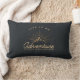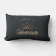 Een lendenkussen met een gouden kleurige illustratie op een zwarte grijze achtergrond. Ontworpen met een afbeelding van een berg met zonnestralen die van achteren naar buiten schijnen. Typografie zegt: Het leven is een avontuur die droom ontdekt.