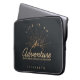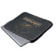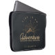 Gespecialiseerde laptophoes met een goudkleurige afbeelding op een zwarte grijze achtergrond. Ontworpen met een afbeelding van een berg met zonnestralen die van achteren naar buiten schijnen. Typografie zegt: Het leven is een avontuur die droom ontdekt.
