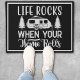 Zwart-wit ontwerp is voorzien van camper en spar bomen. Tekst zegt: "Het leven rockt als je huis rolt." Witte porties hebben een korrelig effect.