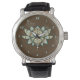 Lagen van Keltisch weefsel en Indian Mehndi van het Lotus Weave-ontwerp zijn gemaskeerd onder een lotusbloesemvorm in tinten van blauwgroen en bruin. Dit horloge is verkrijgbaar in verschillende maten, kleuren en stijlen, inclusief maten voor zowel kinder als volwassen.