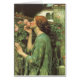 Jonge vrouw met donkerrood haar komt naar boven in de richting van een klimmend roos om de geur te ruiken. Mooie kunst uit de 19e eeuw van John William Waterhouse.