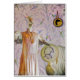 Een digitaal schilderij van een Smew in een roze kledij met kant-en-kettingen. Er is een stoel met een witte jurk en een pet erop rusten. Een antiek silhouetportret van een eend kop in een donkerbruin rond houten afbeelding lijst, hangt aan de wand. De muur is roze behangpapier met tropische vogels. Copyright ©2017 Kimberly J Tilley.