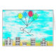 Een tekenfilm met ballonnen om over de stad te vliegen. Digitaal afbeelding.