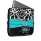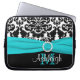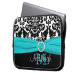 Dit gepersonaliseerde zwart-witte damastlaptop sleeve met een van het aqua blauwe lint FAUX en juweel broche heeft tekstvakjes voor u om met uw eigen naam, monogrammen, handelsnaam, of andere tekst aan te passen. Als u om het even welke hulp het aanpassen nodig hebt, te versturen gelieve niteowlstudio@gmail.com met de elektronische post.
