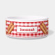 Hete hond snacks op rode geruite stof en aangepast voerbakje