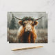 A shaggy Highland cow wearing a leafy wreath gazes at the camera as gentle snow falls in a wintry field.