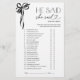 Vier de eigenaardigheden, romance en kleine verrassingen die het liefdesverhaal van een paar uniek maken met deze He Said, She Said-game. Ontworpen met tijdloze elegantie in het achterhoofd, nodigt deze interactieve activiteit gasten uit om te raden wie wat zei - een heerlijke mix van nostalgie, plezier en een vleugje vriendelijke concurrentie creëren. Het klassieke zwarte lintmotief en de gepolijste typografie zorgen ervoor dat zelfs de meest speelse momenten verfijnd en mooi samengesteld aanvoelen. Een ideale aanvulling op vrijgezellenfeesten, verlovingsfeesten of repetitiediners, dit spel combineert lachen met verhalen vertellen, waardoor gasten dichter bij het paar komen op een manier die zowel intiem als feestelijk aanvoelt. Of je nu een chique brunch, een glamoureuze soirée of een elegante afternoon tea plant, dit stuk past naadloos in elke evenementenomgeving. Op zoek naar coördinerende design, aangepaste bewoordingen of een uniek kleurenpalet? De ontwerper is beschikbaar om uw visie tot leven te brengen met op maat gemaakte details die uw feest verheffen. Copyright Anastasia Surridge, alle rechten voorbehouden.