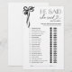 Hij zei dat ze zei zwarte boog Vrijgezellenfeest spel stijlvol en tijdloos, de zwarte boog monochroom wie was eerste zei hij zei ze zei spel Kaart heeft een handgeschilderde zwarte lint boog in de bovenhoek, in combinatie met chique typografie en gedurfde zwarte lippen en snor iconen voor een strakke, moderne look. Gasten kunnen hun gissingen omcirkelen voor wie de "eerste" was in verschillende relatie momenten, waardoor het een leuk en interactief vrijgezellenfeest spel is. Copyright Anastasia Surridge, alle rechten voorbehouden.