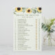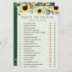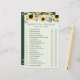 Een stijlvol en stijlvol vrijgezellenfeest gameontwerp dat ideaal is voor de toekomstige bruid in landstijl. Ons ontwerp bevat onze handbeschilderde waterverf gouden gele zonnebloemen, witte roomfloralen en natuurlijke groenheden die zijn ingericht om deze elegante landstijl te creëer. "Bride of Groom Raad wie het zei" wordt bovenaan getoond. De gouden gloed, de crème en het bosgroene kleurenpalet creëer een elegante rustige landstijl. De gele Waterverf waterverf bloemen zonnebloemen en groen lijst bovenaan. Aan de achterkant is ons complementaire waterverf gele zonnebloempatroon zichtbaar. Alle bloemen zijn met de hand getekende originele kunstwerken van de Moodthologie.
