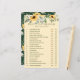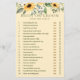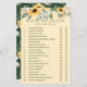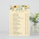 Een stijlvol en stijlvol vrijgezellenfeest gameontwerp dat ideaal is voor de toekomstige bruid in landstijl. Ons ontwerp bevat onze handbeschilderde waterverf gouden gele zonnebloemen, witte roomfloralen en natuurlijke groenheden die zijn ingericht om deze elegante landstijl te creëer. "Bride of Groom Raad wie het zei" wordt bovenaan getoond. De gouden gloed, de crème en het bosgroene kleurenpalet creëer een elegante rustige landstijl. De gele Waterverf waterverf bloemen zonnebloemen en groen lijst bovenaan. Aan de achterkant is ons complementaire waterverf gele zonnebloempatroon zichtbaar. Alle bloemen zijn met de hand getekende originele kunstwerken van de Moodthologie.