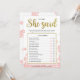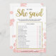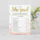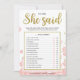 Dit moderne bloemige "Hij zei dat zij zei" bruidsfeest spel heeft een roze bloemige achtergrond met gouden glitter spetters. De tekst is geschreven in een mix van een speelse kalligrafie lettertype en een modern schreefloos lettertype, deze Hij zei dat zij zei kaart is gepersonaliseerd met de naam van de aanstaande bruid en de datum van het bruidsfeest.
