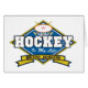 Blauwe en gouden driehoek sport logo met een kruisje hockey stick en hockey puck met Hockey is Mijn levenstekst! Geboren om te spelen, bestemd om gele banner over de bodem te winnen! Geweldige hockeycadeautjes!