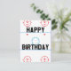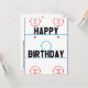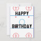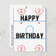 Het is een hockeyverjaardagskaart met een quiz op de achterkant.