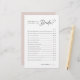Breek het ijs met dit spel "Hoe goed ken je de Bride?" dat gasten ertoe aanzet vragen over de bruid te beantwoorden en hun nummer correct te beschrijven. Gebruik het Hulpmiddel van het Ontwerp om de vragen aan te passen indien gewenst, of verander kleuren om uw thema van het vrijgezellenfeest aan te passen.