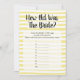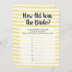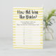 Geel en wit raden het spel 'The Bride's Age' voor vrijgezellenfeesten. Handgetrokken witte horizontale strepen.